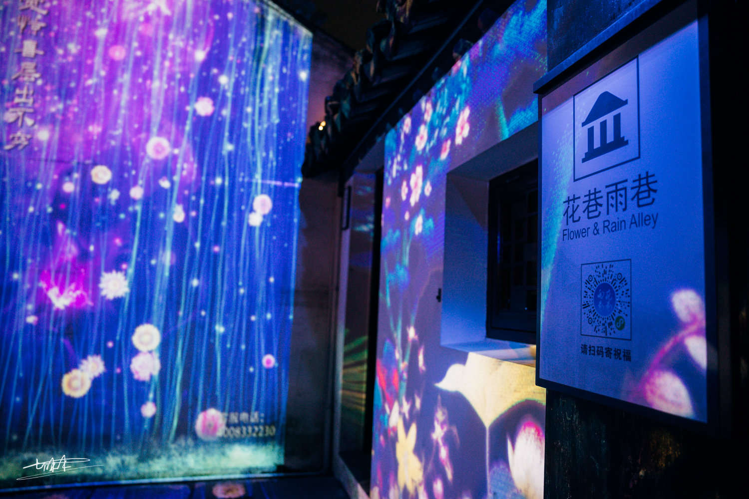 夜晚的雨巷花巷,粉黛纷飞。从古镇福洪桥至贞丰桥段打造以花巷和雨巷为主题的灯光秀区。穿行其中,品味水乡生活的文化气息,光影、装置、互动的新媒介融合手法,点亮周庄。