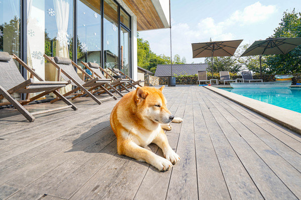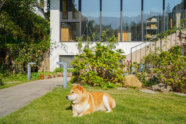 还没走到前台就发现院子里的小柴犬“旺财”,一点也不怕陌生人,悠闲的躺在泳池边晒太阳。后来听老板说,旺财两个月就到民宿里了,是店里的“老员工”,很多客人都喜欢来这里撸狗。