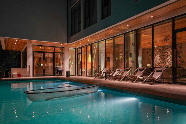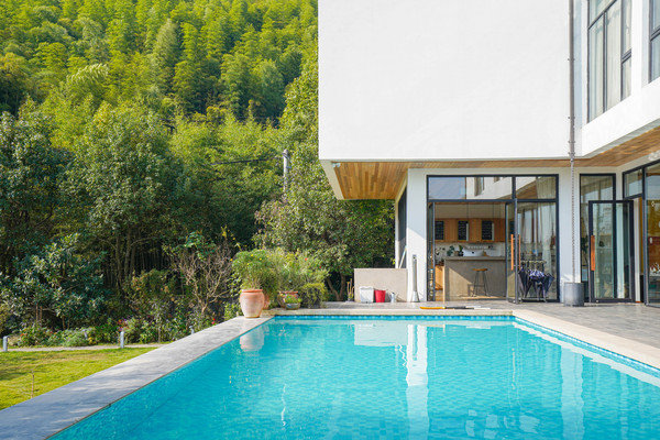 走过曲径通幽的走廊,便来到了民宿所在院子里,白色的尖顶房屋,大大的泳池,充满了时尚和设计感,又不缺度假民宿的氛围。