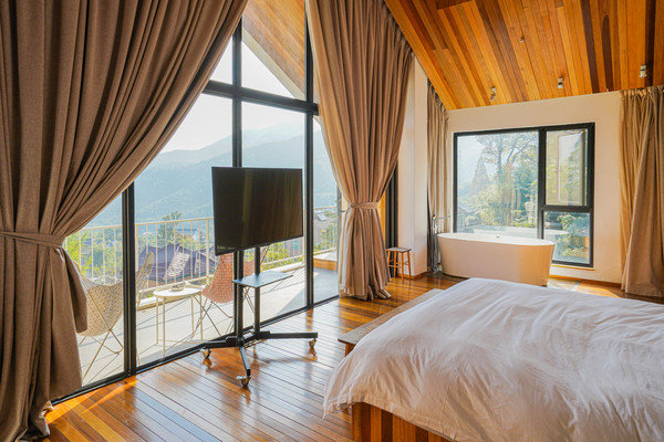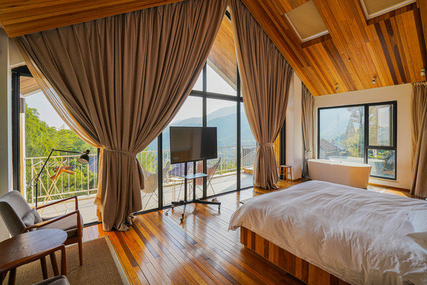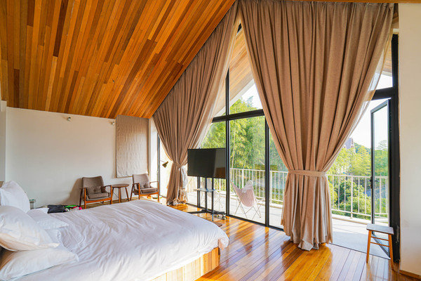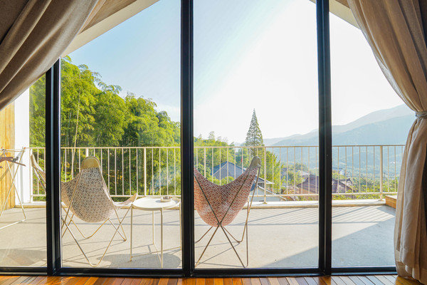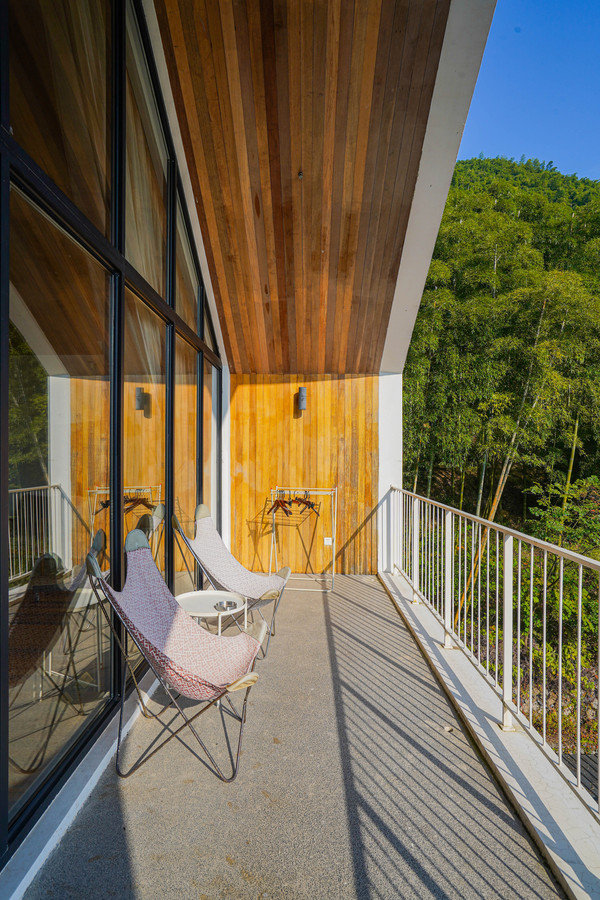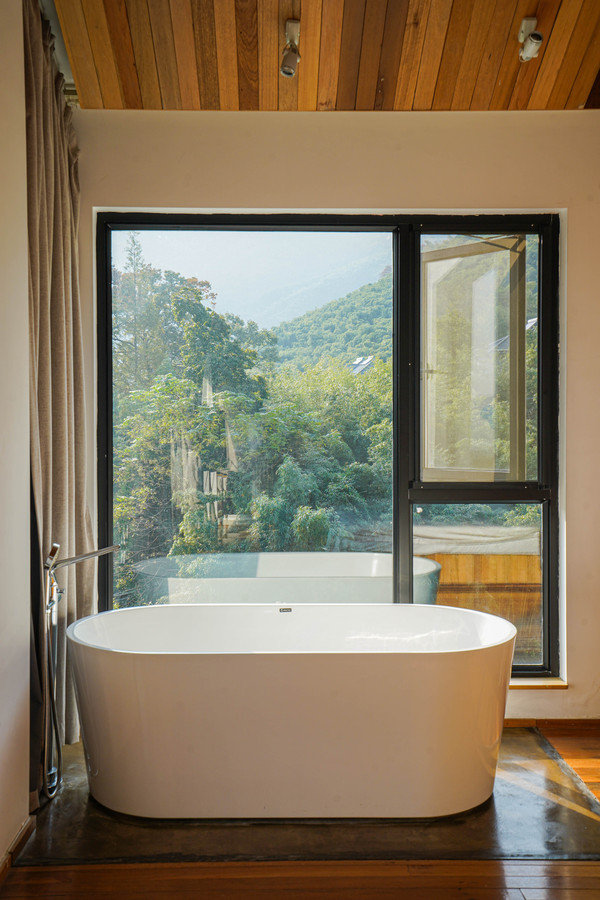 因为三面透光,所以躺在床上、浴缸中,坐在阳台上都可以欣赏到环抱民宿的大竹海,绝对是放松身心的好地方。