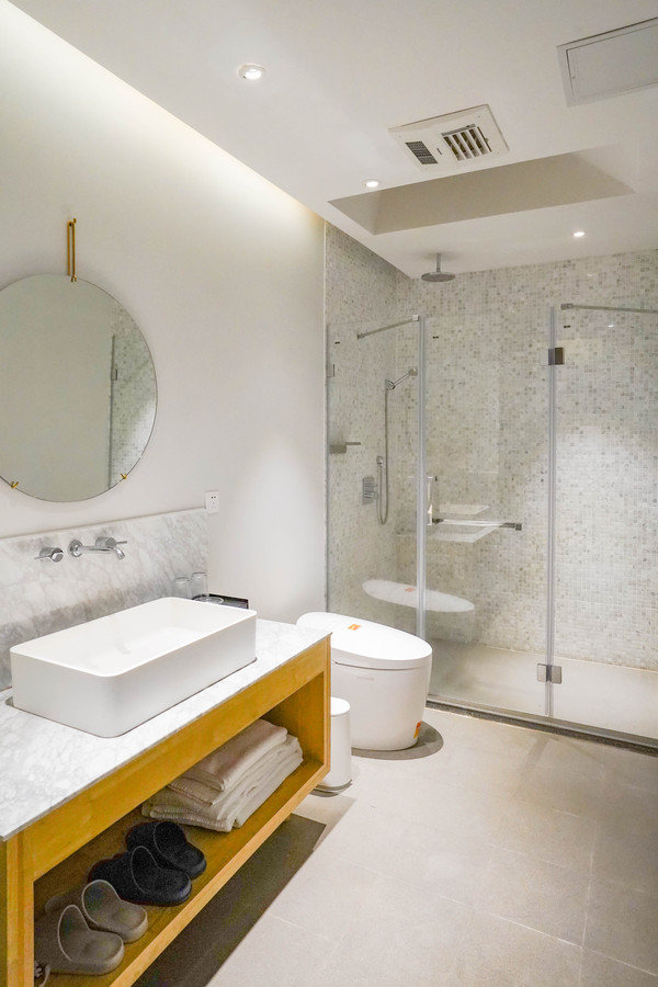 最喜欢洗手间的设计。屋顶有个小天窗,白天的时候阳光从头顶照下,来让浴室的特别的明亮,晚上天气好还可以看到星星。还有智能马桶圈这些就不用多说了,细节满满。