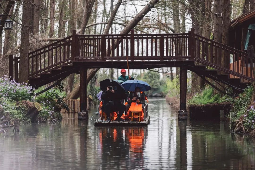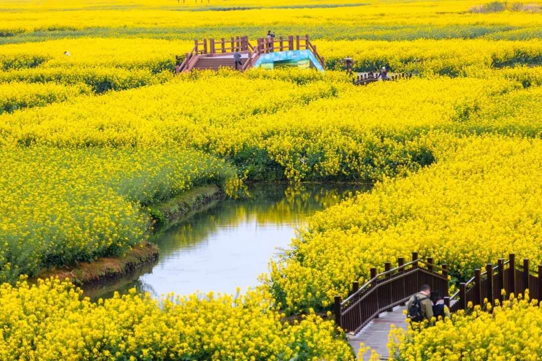 登高远望,盛开的油菜花和纵横的水道相映成趣,一副“油菜花开金满地”的壮阔美景,尽显“船在水上行,人在花中游”的水乡花田的独特浪漫。