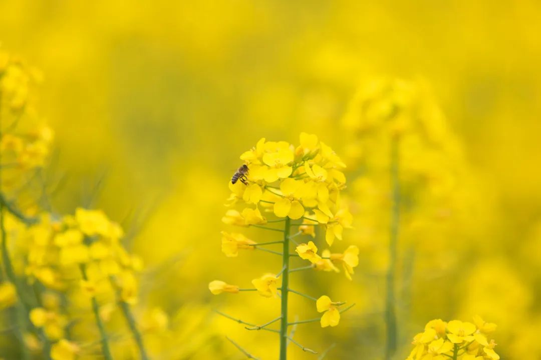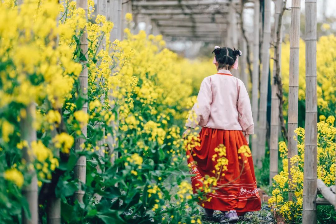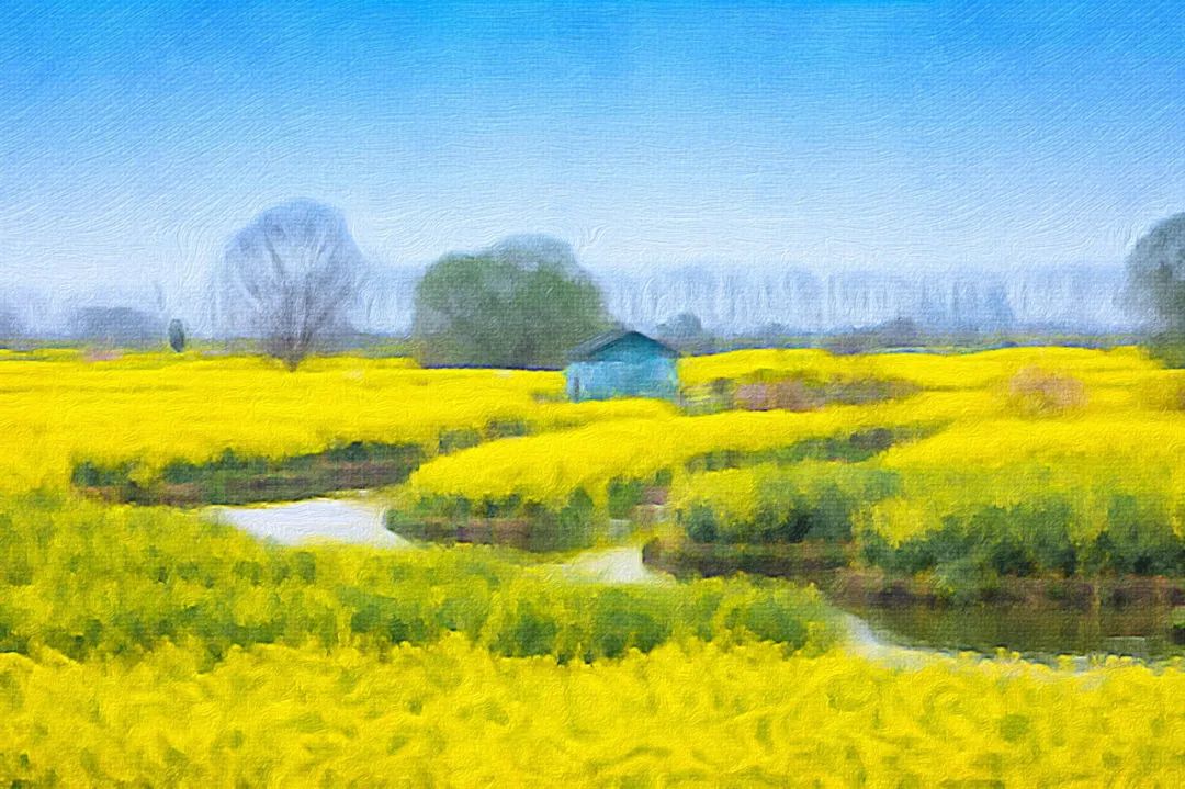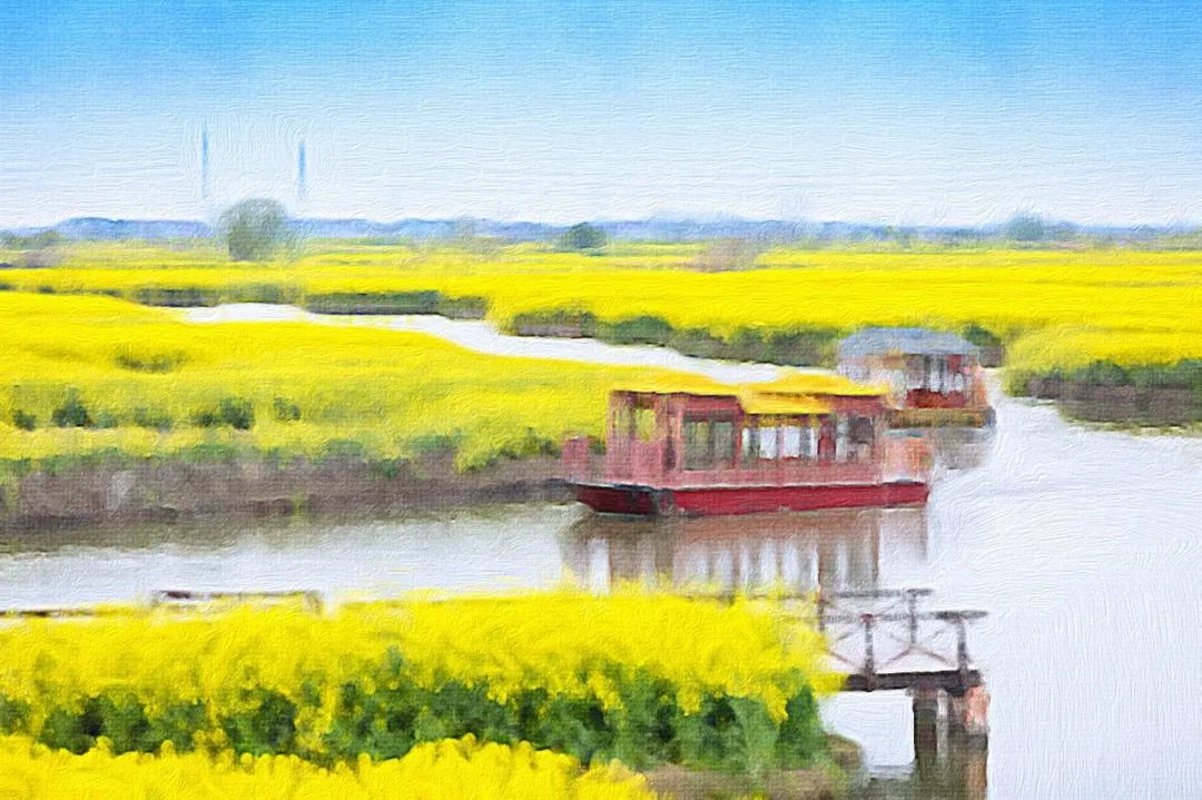 画舫或是木舟飘荡在碧波中,两侧田垛上的菜花,扑面而来,次第展开,宛若金色的迷宫,这一切衬映在碧空之下,绘就了一幅幅绚丽的田园油画。