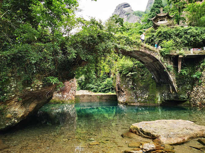 我们去的时候,正值午时,阳光透过树顶与山谷直射下来,折射出美轮美奂的光影,极目远眺,青山环绕,万籁俱寂。整个山峰掩映在一片雾霭之中,那种感觉,宛若远离了喧嚣的尘世,如梦如幻,恍若仙境。
