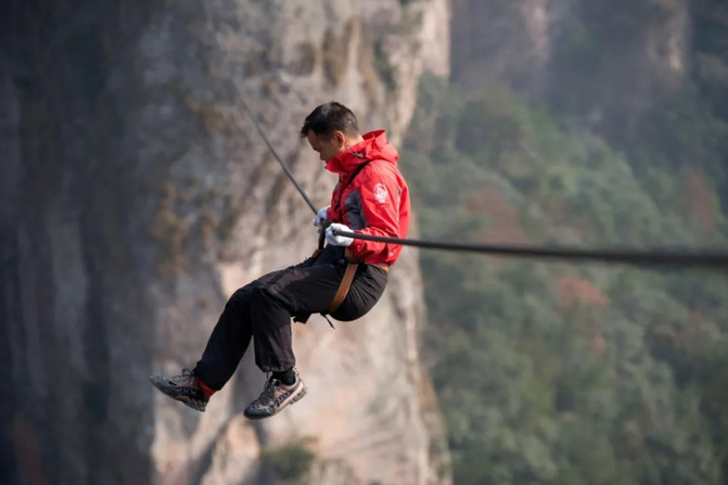灵岩飞渡是 雁荡山 风景区每天都会上演的一项传统杂技表演,据随行导游介绍:它起源于当地山民攀崖采摘石斛的行为,距今有130多年,并于2016年12月列入第五批 浙江 省级非物质文化遗产名录。