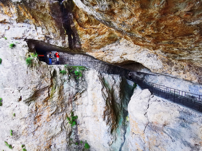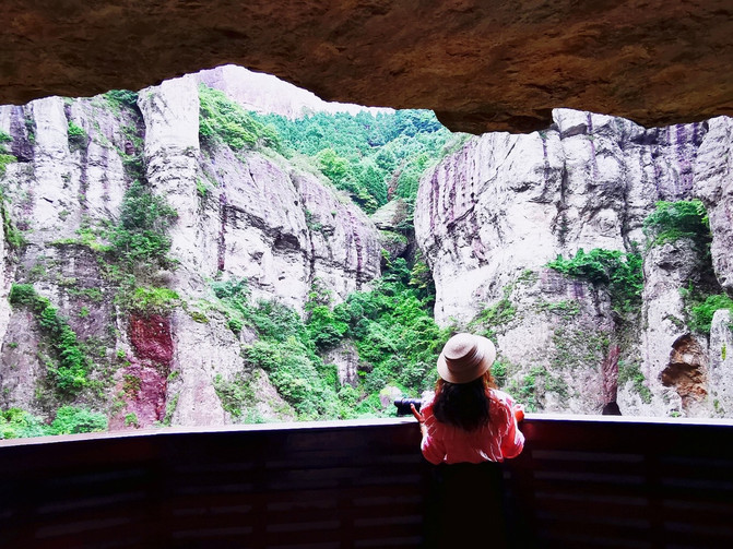 来灵岩景区,有一个必打卡点,那就是方洞。方洞,因其形状而得名, 洞内有三处滴泉,积水可饮,水质甘冽清凉。洞口有百余米的栈道,在绝壁中凌空架起,险峻非常。栈道顺 雁荡山 第三期喷发的流纹岩夹层(即“金腰带”)而行,沿途风景优美,移步换景,景色各异,随处可见各种典型的火山地质现象,令人不得不由衷慨叹大自然的天造地设与鬼斧神工。