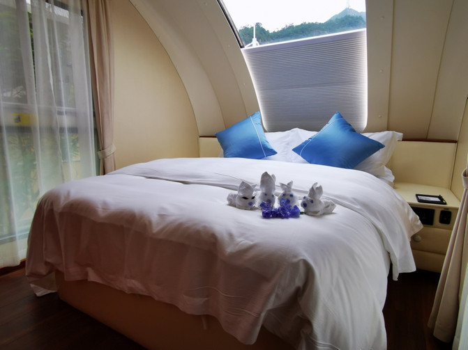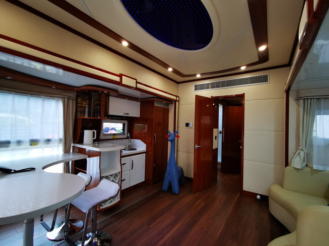房车的设计特别具有时代科技感,创造性的把奢华的住宿空间和原始自然的外部环境融为一体,开门见山,移步换景。看似随意铺陈,实则匠心独具。