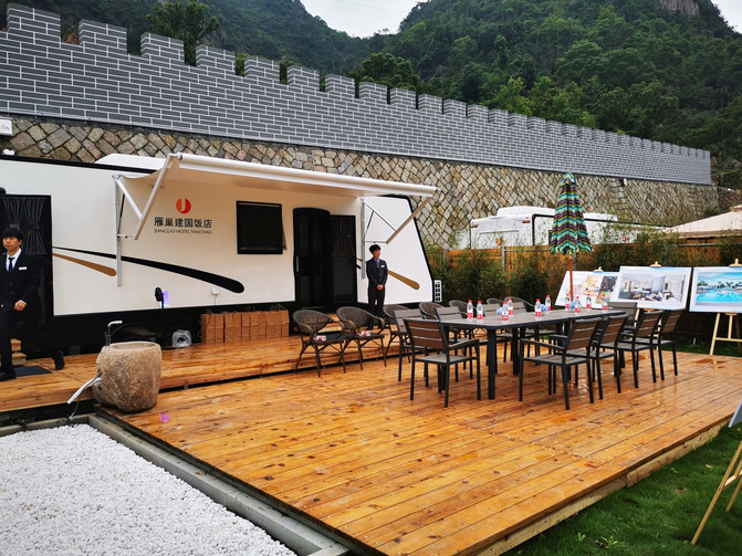 雁荡山 建国度假酒店房车露营地引入国际流行的房车露营度假理念,营地内有亲子--星空庭院房、休闲-棋牌庭院房、雅趣--KTV庭院房、行政商务庭院房等各类房型,第一期投入33辆房车及若干野奢帐篷。