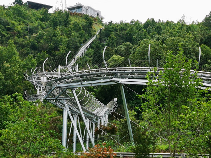 去的时候,远望在山野和树林间盘旋的滑道,真的有一丝胆怯。但坐上去后发现除了上坡有一些后倾的感觉。下坡的时候,则可以自己控制一下车速。稍稍适应下来,你可以逐步放松自我,体验一下那种疾速而下和快速盘旋的感觉。