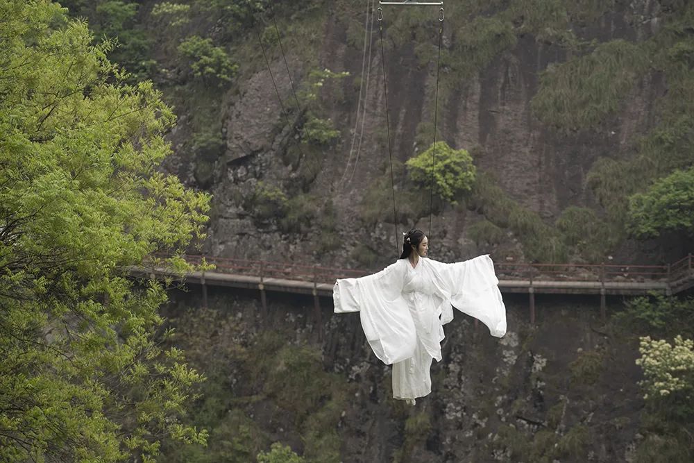 以悬崖峭壁为景,着一袭轻纱般的白衣,莽苍踏歌行,天外飞仙不过如此。