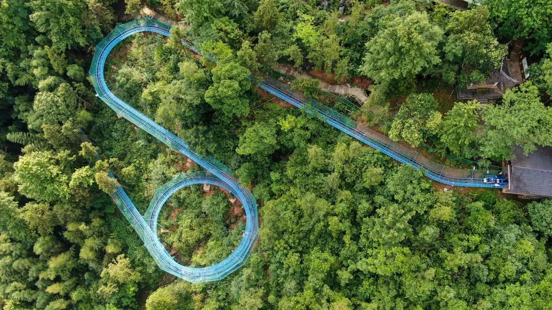 灵栖极速滑道位于清风洞至霭云洞之间,全长1600米,落差99米,可以一边欣赏景区森林公园全貌,一边感受高空滑行风驰电掣的动感刺激。