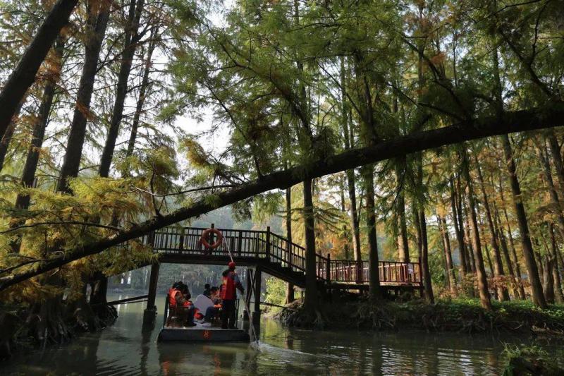 采风团首站来到了李中水上森林景区,在船只上、栈道旁,看林中十万株杉树傲然,亭台石桥错落有致,木质栈道曲径通幽。
