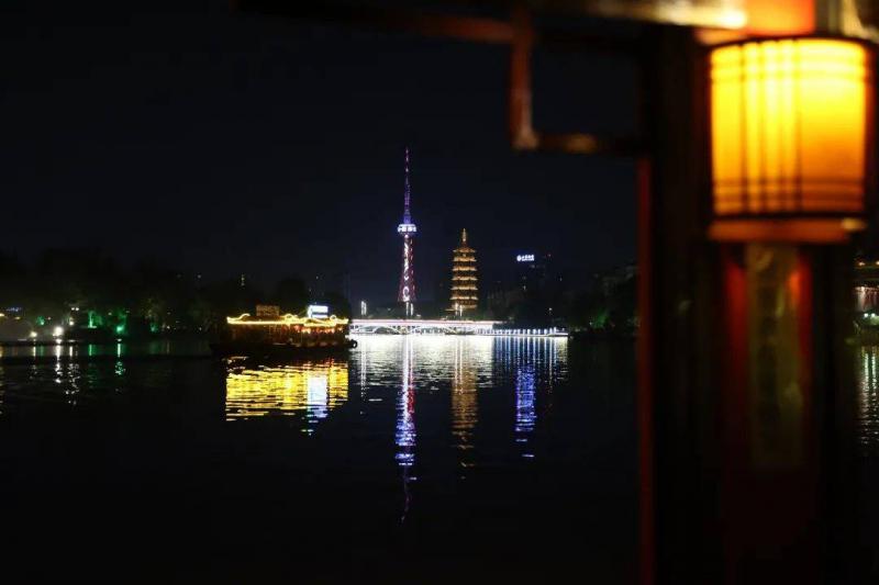 入了夜,达人们乘坐古色古香的画舫游船在凤城河中。望海楼、清风阁、梅园、桃园、乔园、老街等建筑群,被霓虹灯装扮得流光溢彩。