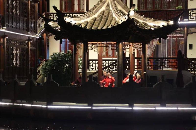 来了泰州,才知道“入夜听闲戏”并不是戏说,沿岸的昆曲《桃花扇》、京剧《贵妃醉酒》、古乐《梅花三弄》等古装表演,令人如痴如醉,仿佛穿越到戏文唱词中,与主人公一同体会悠扬婉转的儿女情长了。
