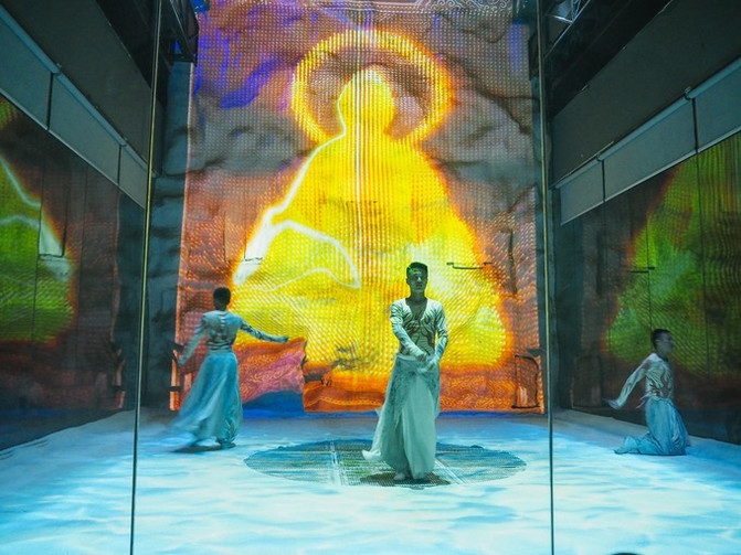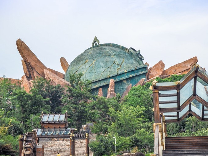 浑天仪造型的天幕影院,4D电影再现盘古开天劈地创世纪传说,科技感十足。