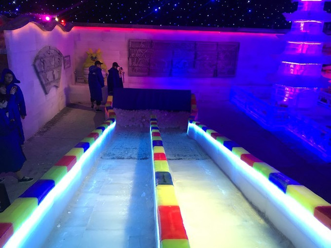 里面不仅有好看的的冰展,还有可供玩乐的滑梯,有个橡皮圈给你坐上去滑下来,猛然的就让我想到在哈尔滨 玩冰梯的日子,跟这里一样,冻的的我 耳朵疼哈哈~