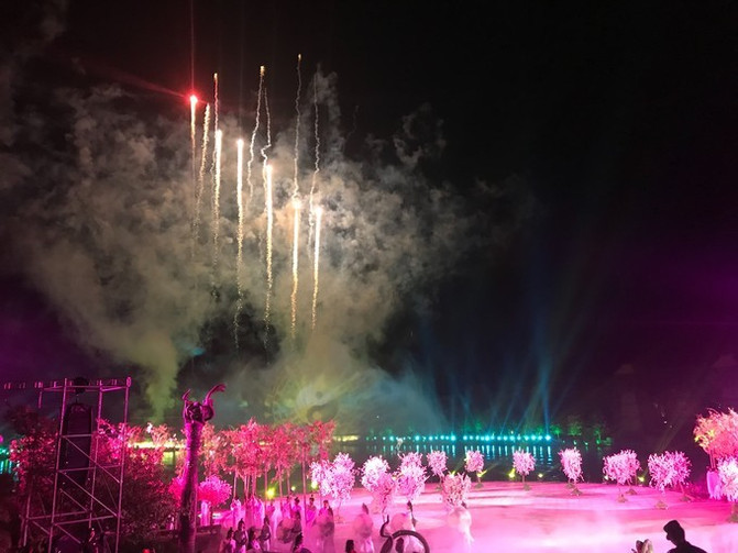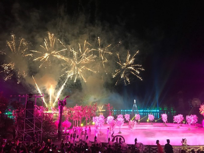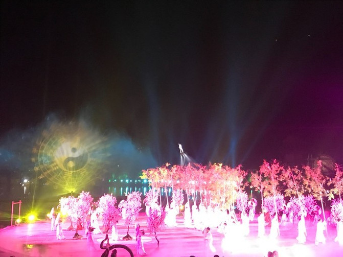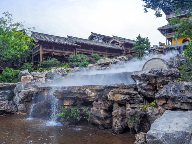 千里仙韵幻影秀,1000亩山镇化成实景光影秀场,山镇的街道上一步一景,一景一舞台,喜泉阁等道风十景再现山镇。