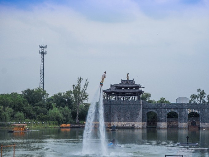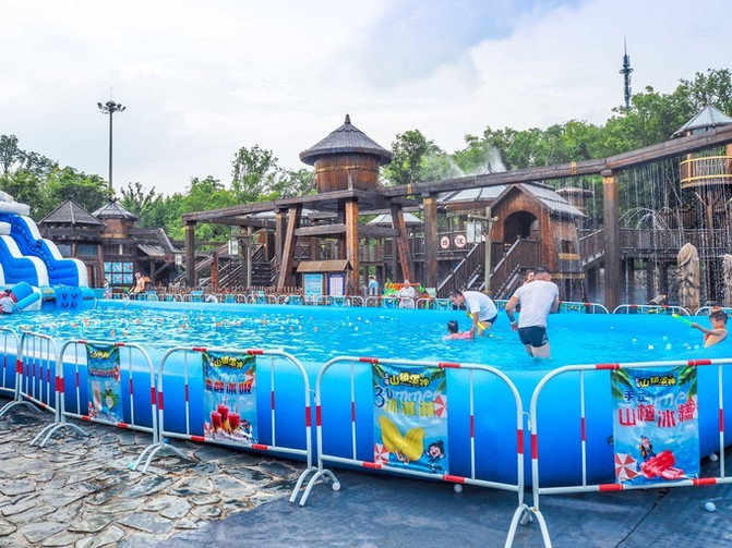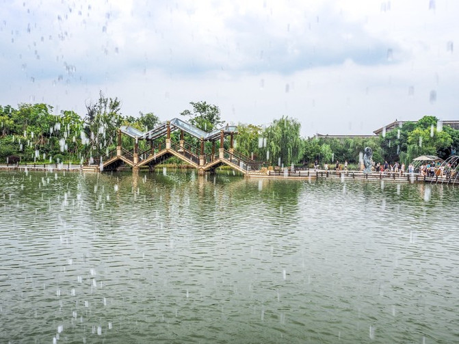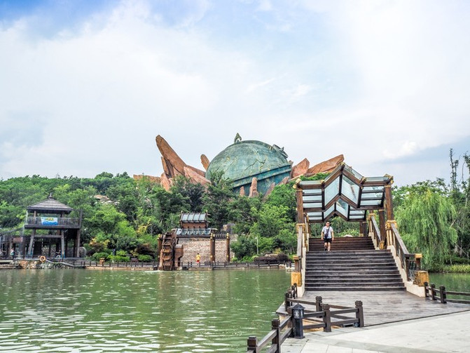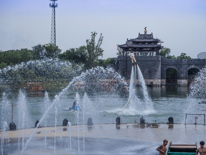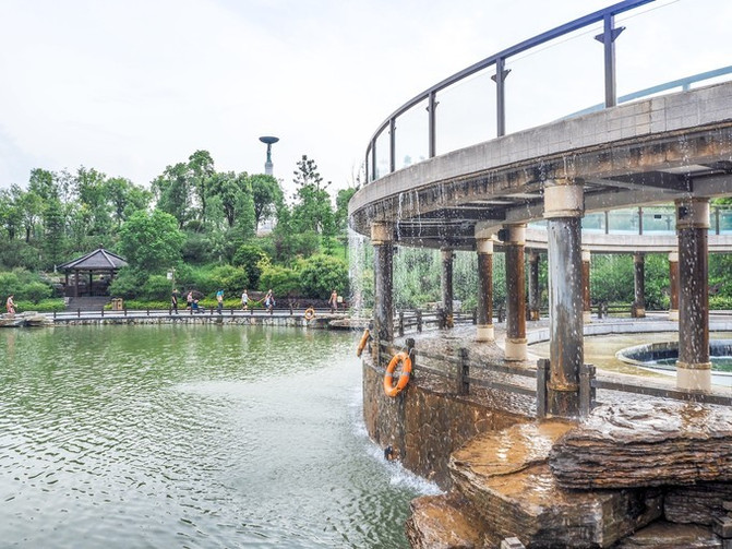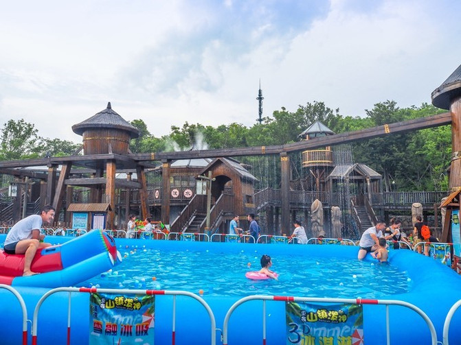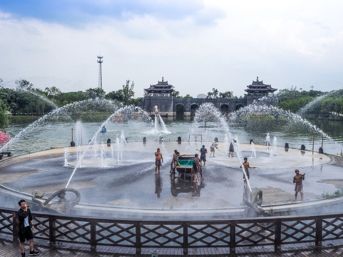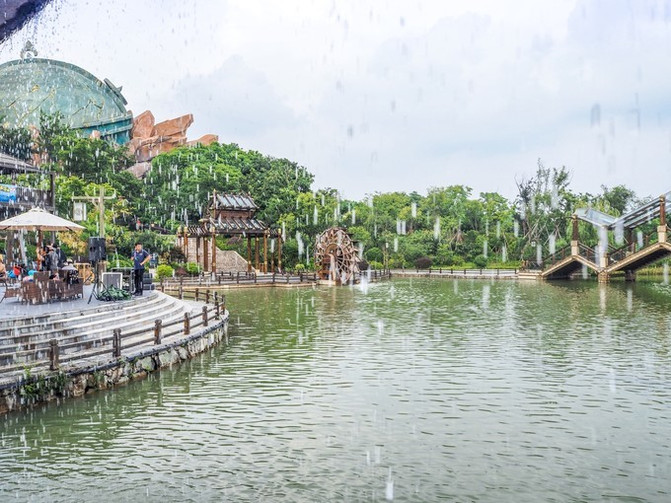 这里是一个亲子水上乐园,很适合节假日带着宝宝来玩耍,是个古朴的水寨造型,水上项目很丰富,有彩虹跳跳泉、音乐喷泉等。