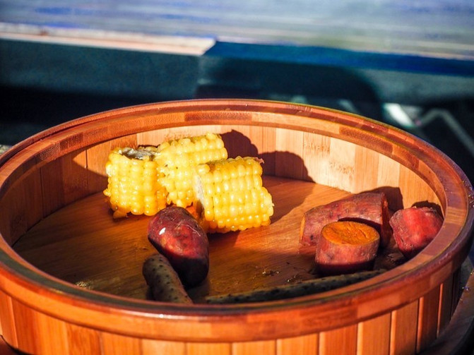 菜品有炸黄鱼,玉米红薯等杂粮,肉包,肉骨头,银耳羹,豆腐等,吃完都是饱饱的。
