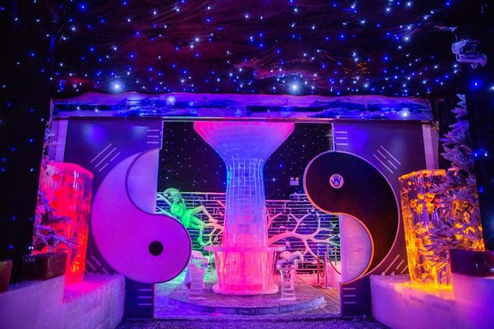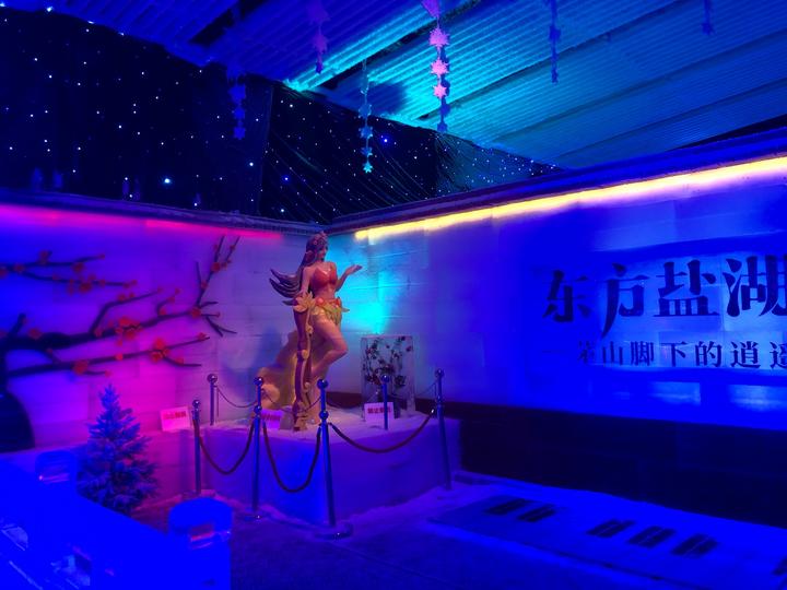 穿上羽绒服一进入冰屋身旁的人直呼凉爽,这里恍如冰火两重天,周围都是冰雕和道家文化的建筑,地上都是撒的盐雪防滑,冰屋不大,但是每一角都有别样景致。