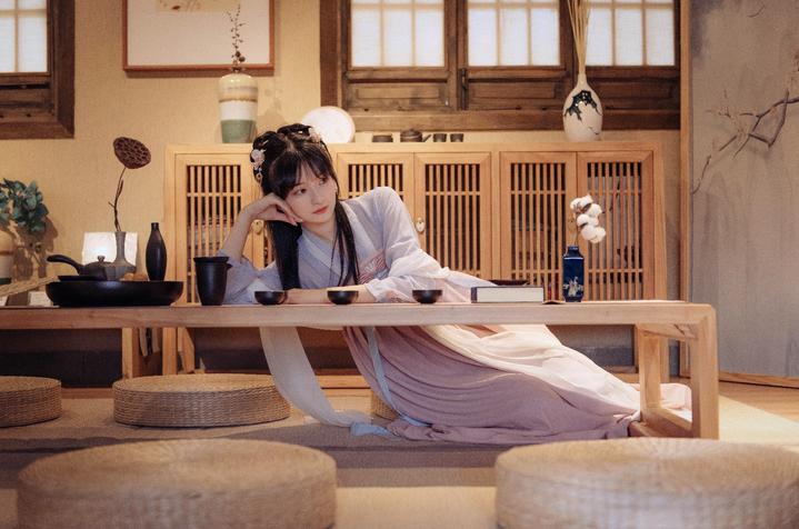 身着汉服乘一叶扁舟,碧波荡漾间看两岸山镇的美景,微风拂面,惬意安然。