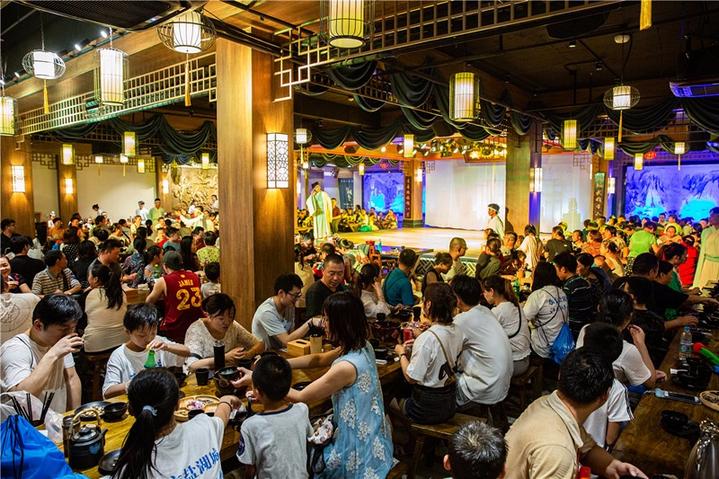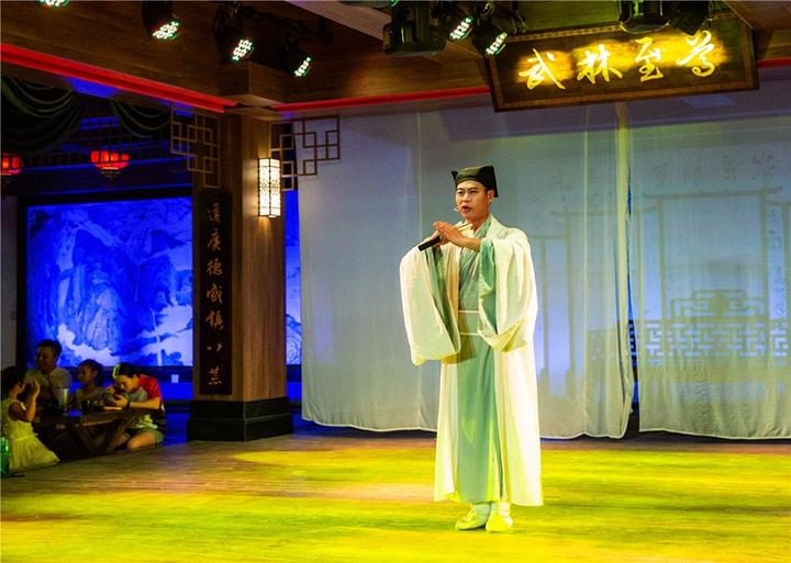 用餐前,导演会挑选6个游客在后台换装,6个人分别是6大门派的掌门人,峨眉派、古墓派、五毒派……换装结束后安排坐在舞台前的中间席位6大“长老”一同用餐。