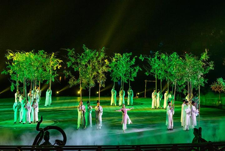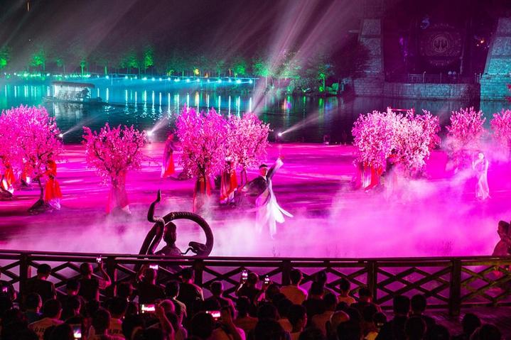 太极广场上,一幕“逍遥游”正上演的如火如荼,故事讲述的是古代一对男女终成眷侣的经历,舞台上的演员生动演出,深情互动,台下的观众聚精会神,都将自己沉浸在这场精彩的演出中。