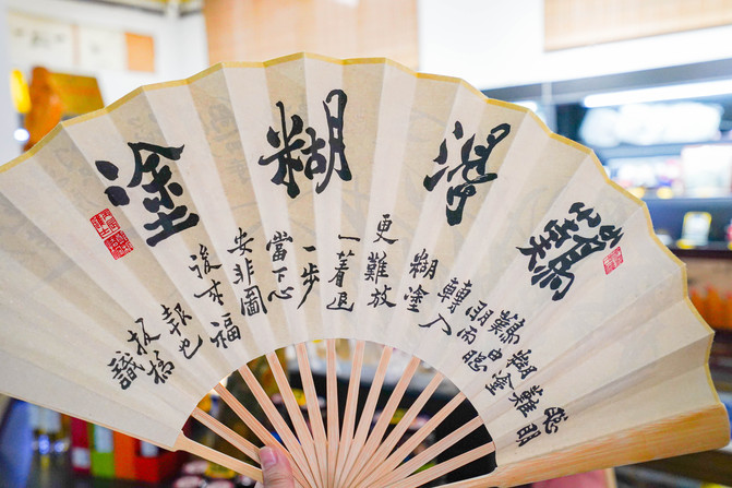一进展馆就看到印有难得糊涂字样的折扇,字是郑板桥的字。