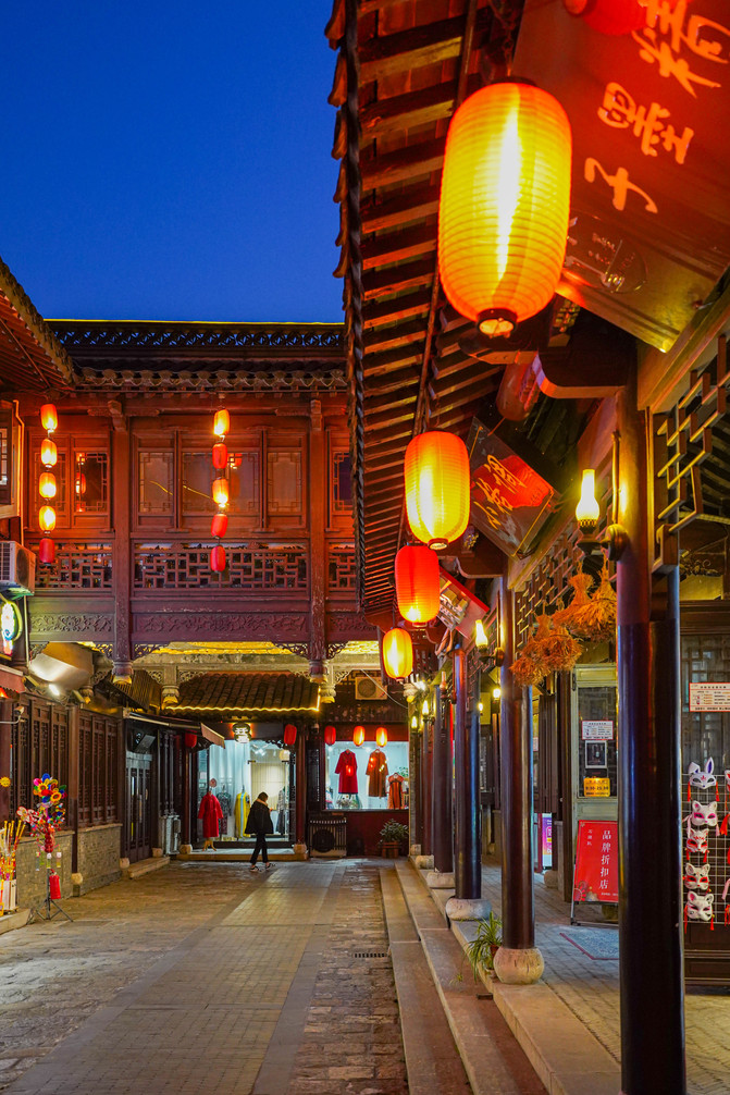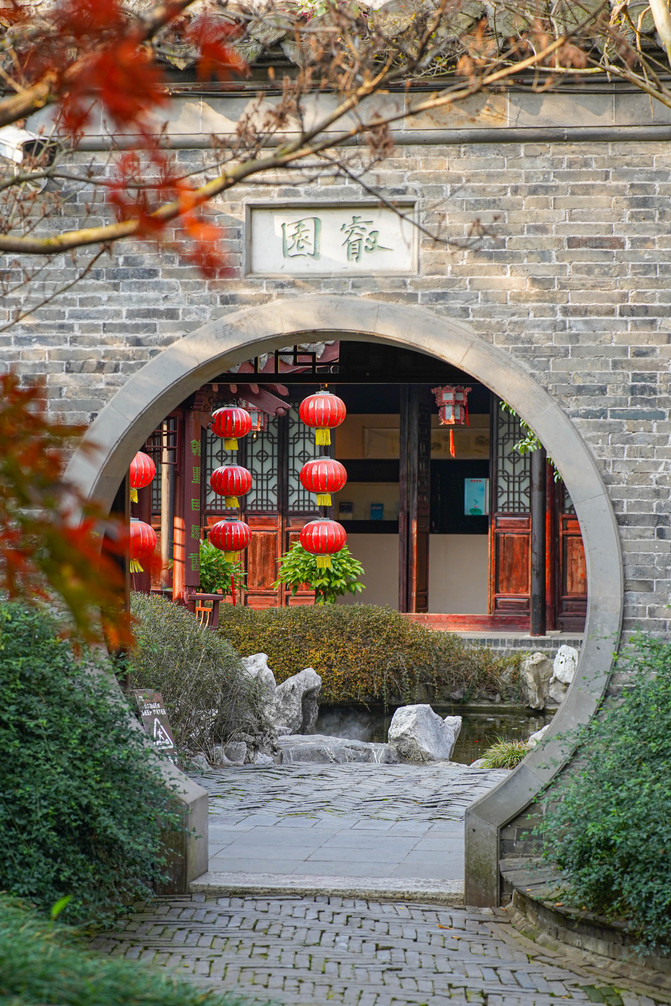 老街毗邻的桃园,穿过古牌坊进入古老的麻石街巷,迎街两侧为仿古的店铺,大红灯笼、店幌、匾额,让这条老街韵味十足。