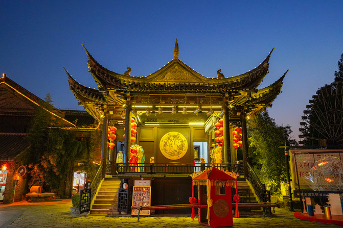 老街上还有一座古戏楼,飞檐翘角、画栋雕梁,夜色和灯光的映射下更加的熠熠生辉。