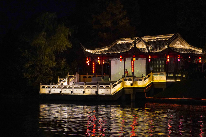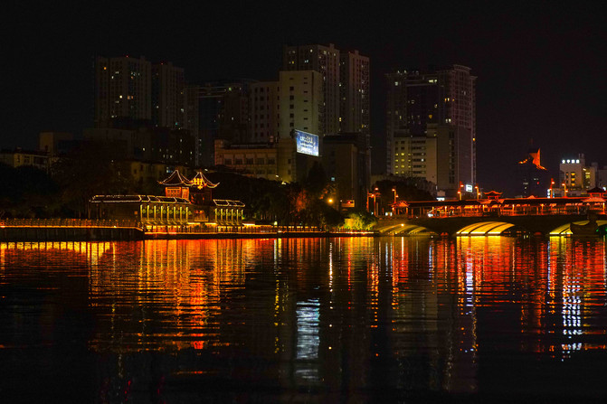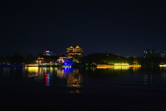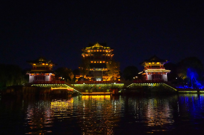 夜晚的景色格外的迷人,灯光洒在河面上波光粼粼的,远远可以看到望海楼、文昌阁、齑汤桥、迎春桥以及下午去过的桃园等。