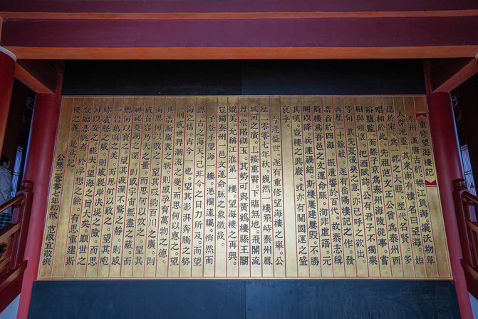 走进望海楼,首先映入眼帘的是一块鎏金漆器的《重修望海楼记》,三楼是一个关于泰州的介绍展,四楼是观景层,可以围绕楼一圈,欣赏周围的风景。