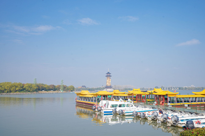首先需要乘船到达主景区的湖东码头,十几分钟可以欣赏到湖边的景色,当地的溱潼会船节就是在这片湖面举行,时间是每年清明的第二天到五一前后左右,准备那个时候来旅游的朋友可以关注一下会船节的时间。还可以远远看到古寿圣寺和药师佛塔。