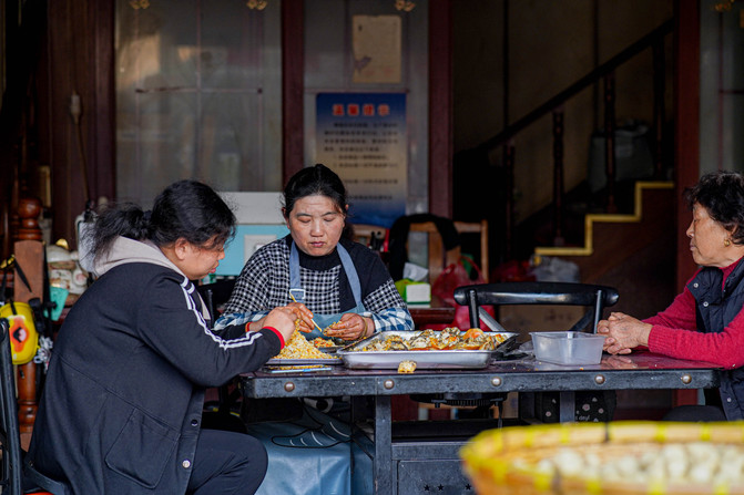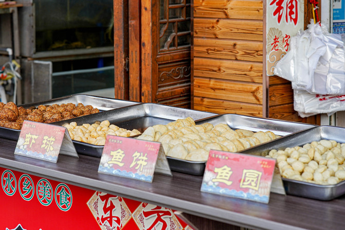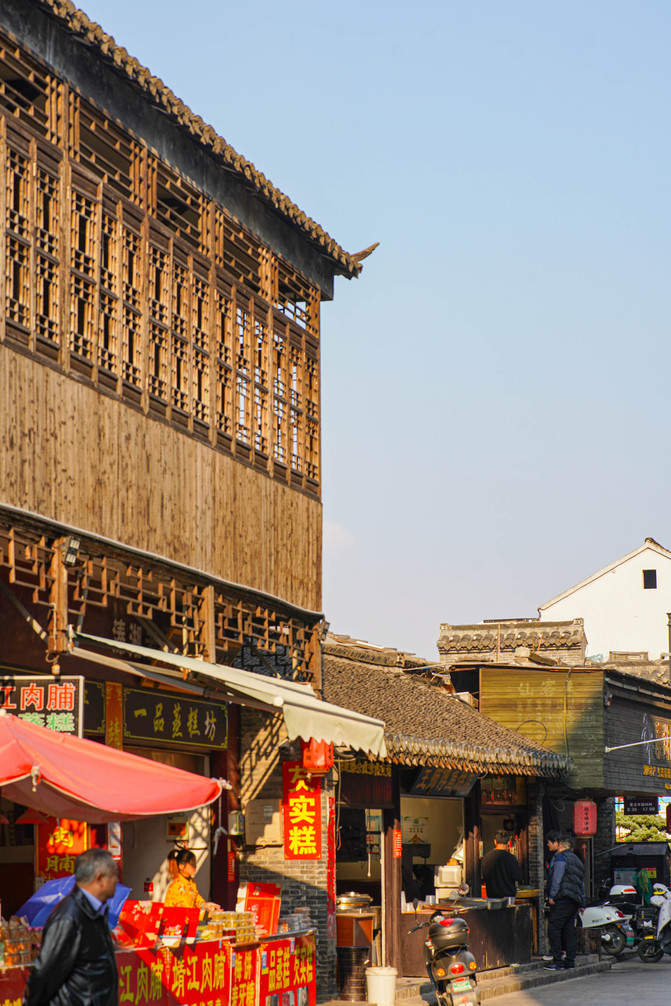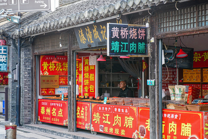 主要是由八个景点以及附近的古镇街道组成。这里还有条藏着条宝藏“商业街”,说是“商业街”却一点也不商业,街道两边都是本地特色的美食,簖蟹、黄桥烧饼、鱼圆、鱼饼、米糕、靖江肉脯、臭干子等等,热情的店主都会主动给我们品尝,不是寻常古镇卖的东西,很多本地人专门来买,生活气息非常浓郁。