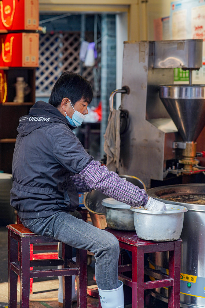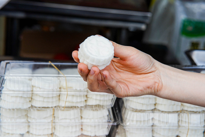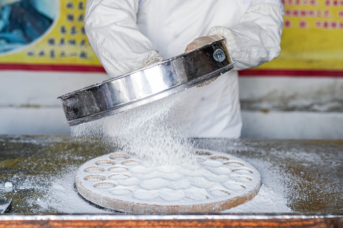 桂花米糕清淡的米糕透出一丝丝桂花的清香,一口气能吃好几个,古镇口第一家师傅手艺一绝,看着他几分钟就把米粉做成了一整版米糕