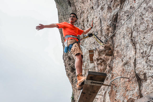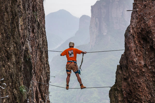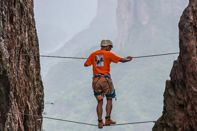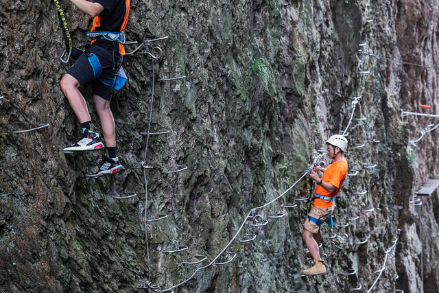 雁荡山的飞拉达是修建在悬崖绝壁之上,利用铁索、脚蹬复制,让普通人也能完成峭壁攀爬。据说这是目前华东地区最具挑战性、景观最漂亮的飞拉达体验项目。
