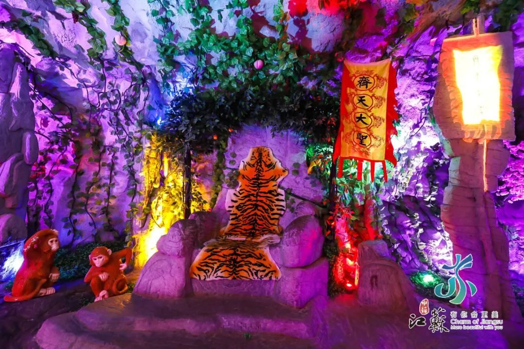 穿过瀑布,进入洞中,能看到一间酷似石房的自然洞,洞内的怪石,状如石座、石床、石凳,可坐可卧,趣味万千。霓虹灯的照射和独特的置景,为水帘洞增添了几分神话中的神秘色彩。